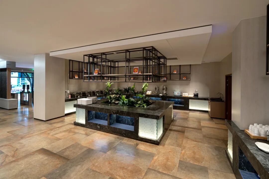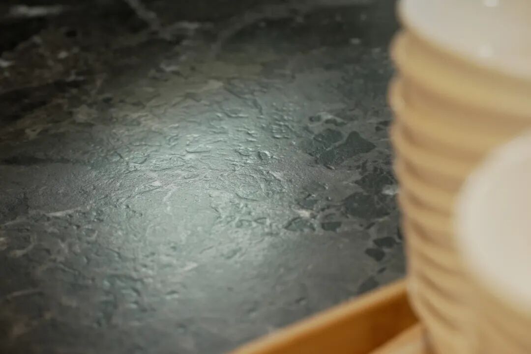 The buffet countertops, made from KLAX's 'Meteorite Black', bring an authentic, natural touch. Their stain-resistant, wear-resistant, and easy-to-clean properties ensure practicality. As seasonal local ingredients are transformed into exquisite dishes displayed here, the space comes alive with a magic that engages all five senses.