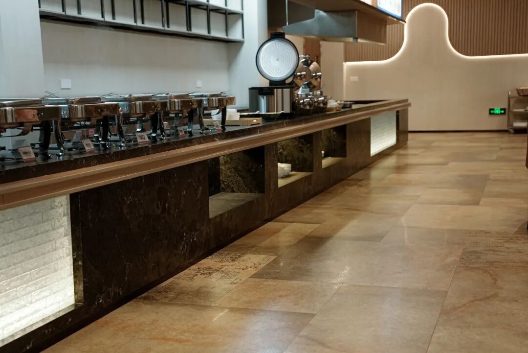 The buffet countertops, made from KLAX's 'Meteorite Black', bring an authentic, natural touch. Their stain-resistant, wear-resistant, and easy-to-clean properties ensure practicality. As seasonal local ingredients are transformed into exquisite dishes displayed here, the space comes alive with a magic that engages all five senses.