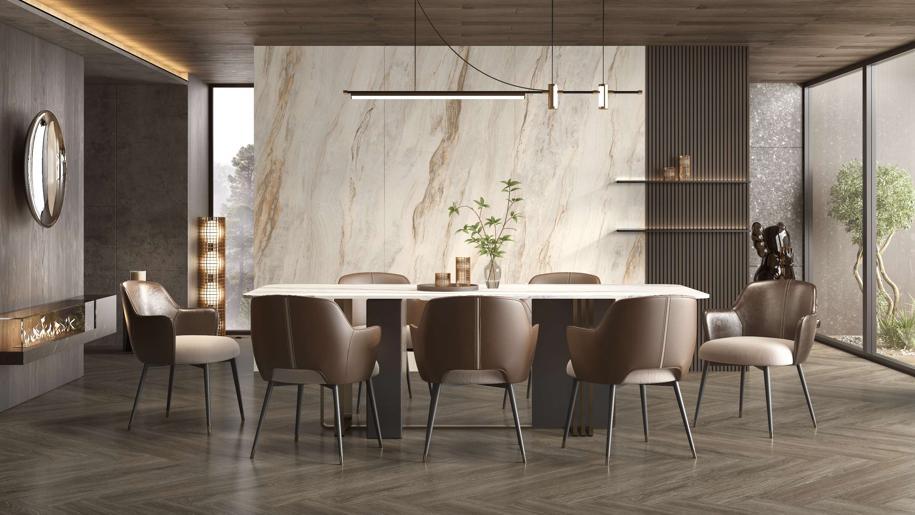 The marble effect porcelain tiles showcases a network of intricate, natural stone veins that are endlessly varied and visually pleasing. The surface is smooth and silky to the touch, with subtle variations in texture. Its luxurious and grand patterns make it ideal for open spaces, creating a modern, understatedly elegant atmosphere.