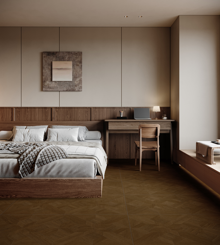 Drawing inspiration from the caramel-hued woods of a Provençal autumn estate, this Caramel Wood flooring tiles collection features naturally clear and dynamic wood grains, enhanced with intricately carved Chinese knot patterns—creating an atmosphere where natural beauty meets refined craftsmanship.
