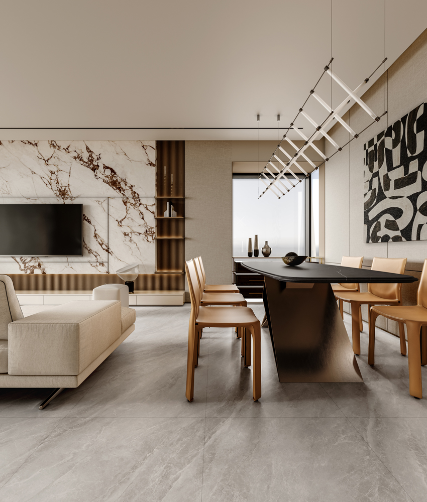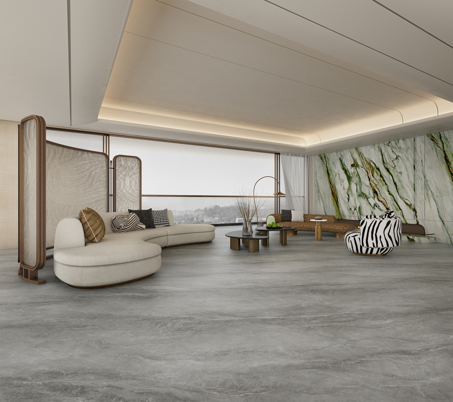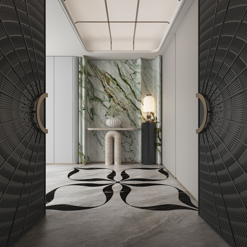 With random multi-directional pattern alignment, this collection creates a seamlessly integrated and imposing aesthetic—whether applied to walls or floors.